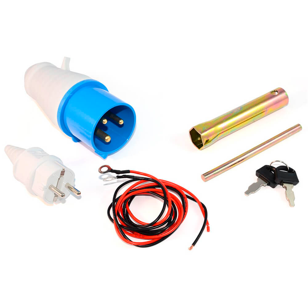 Электрическая вилка - 3 шт., комплект проводов, свечной ключ, ручки и колёса