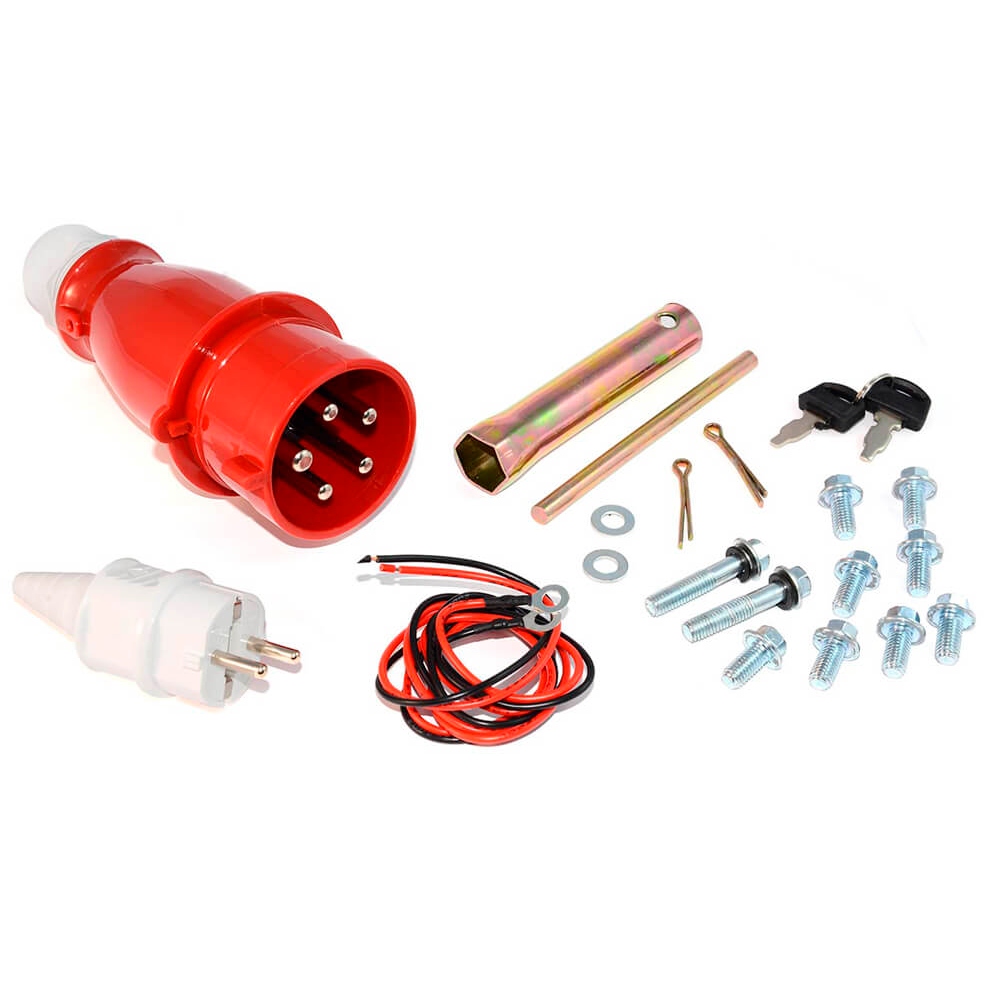 Электрическая вилка - 3 шт., комплект проводов, свечной ключ, ручки и колёса
