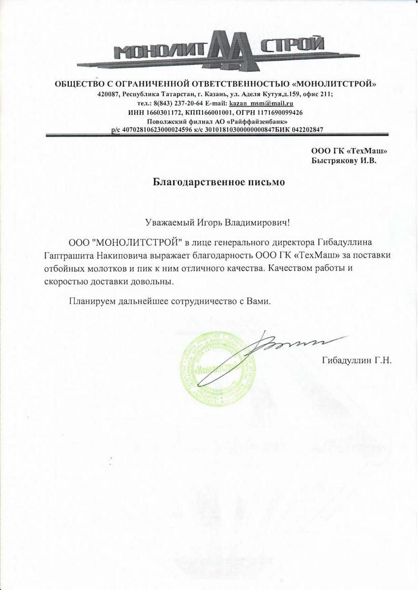 Благодарственное письмо от ООО "МОНОЛИТСТРОЙ"