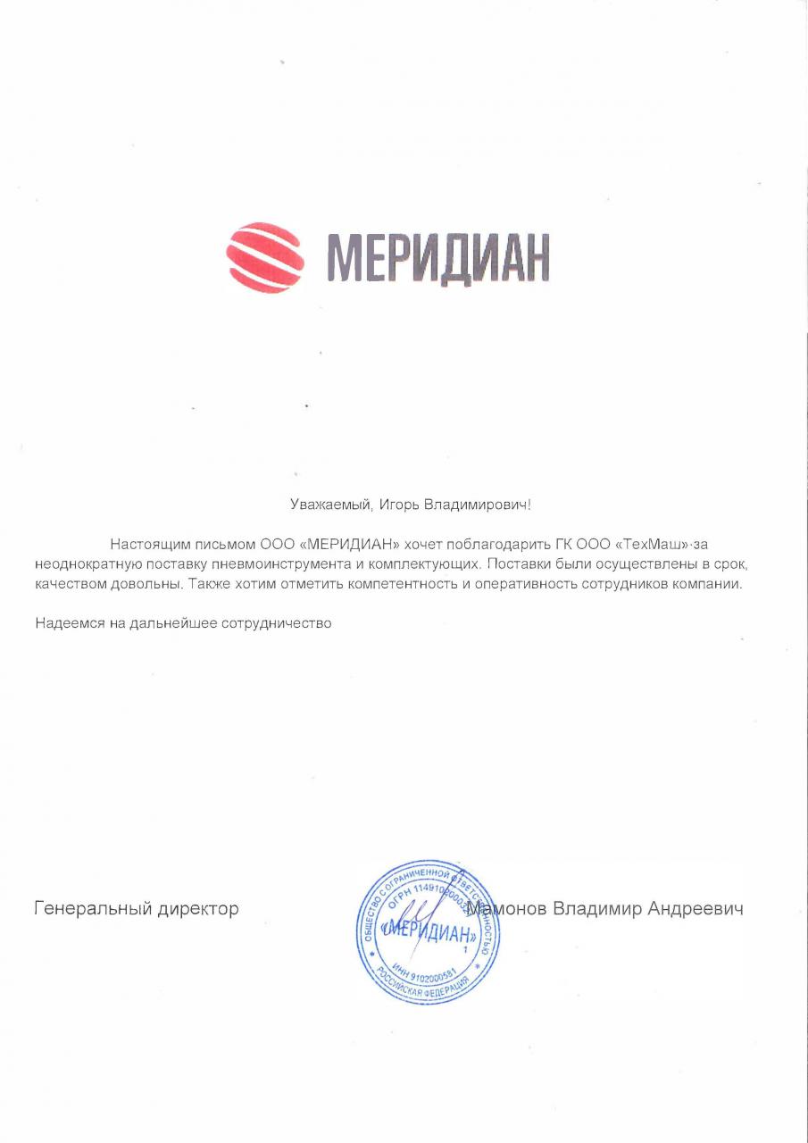 Настоящим письмом ООО «МЕРИДИАН» хочет поблагодарить ГК ООО «ТехМаш»-за неоднократную поставку пневмоинструмента и комплектующих. Поставки были осуществлены в срок, качеством довольны. Также хотим отметить компетентность и оперативность сотрудников компании.