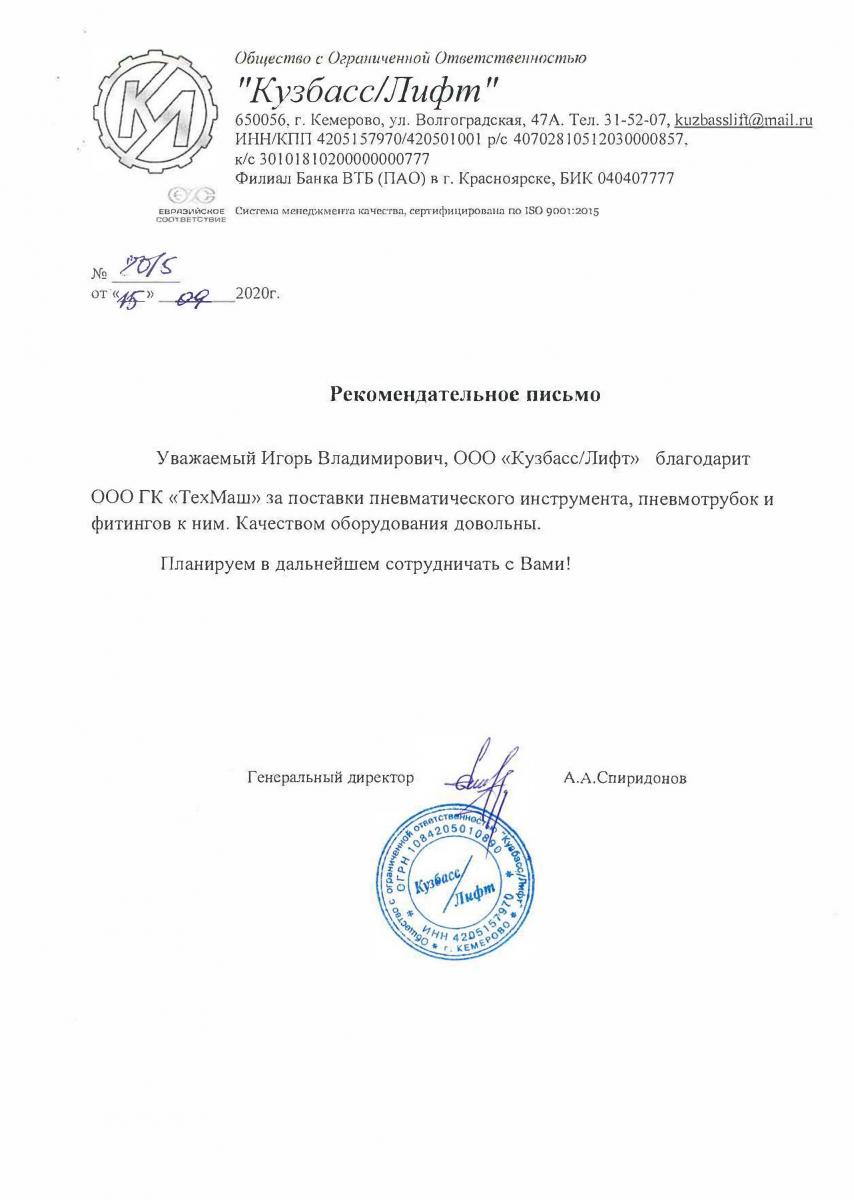 ООО «Кузбасс/Лифт» благодарит ООО ГК «ТехМаш» за поставки пневматического инструмента, пневмотрубок и фитингов к ним. Качеством оборудования довольны.