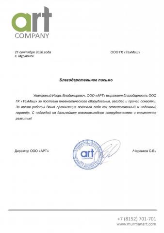 ООО «АРТ» выражает благодарность ООО ГК «ТехМаш» за поставки пневматического оборудования, гвоздей и прочей оснастки. За время работы Ваша организация показала себя как ответственный и надёжный партнёр. С надеждой на дальнейшее взаимовыгодное сотрудничество и совместное развитие!