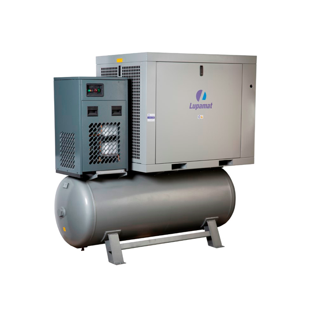 Компактные модели компрессоров Lupamat серии MITK с впрыском масла, низкоскоростным вентилятором, встроенным осушителем, установленные поверх горизонтального ресивера используются во всех областях промышленности.